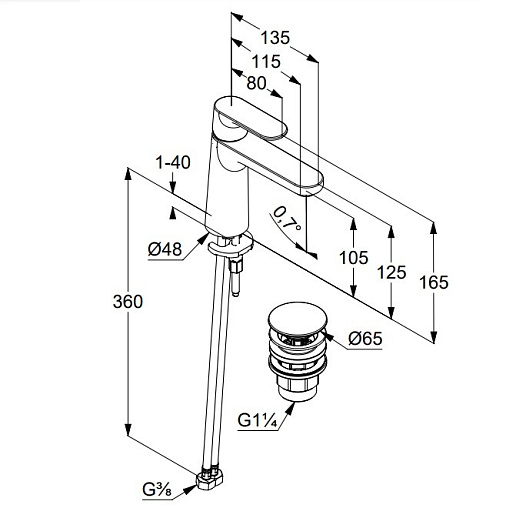 Смеситель для умывальника Louva push-open, высота до излива 10см, неповоротный излив, с донным клапаном, Kludi