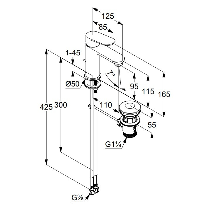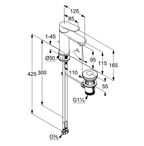 Смеситель для умывальника X1 высота до излива 9,5см, неповоротный излив, с донным клапаном, Kludi