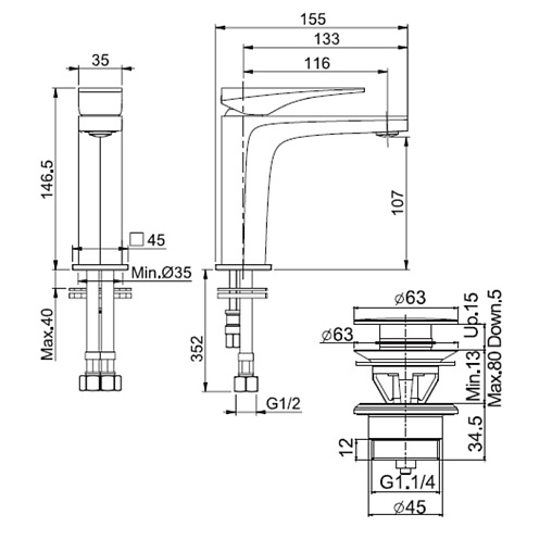 Смеситель для умывальника Zeta click-clack, матовый, чёрный цвет, неповоротный излив, с донным клапаном, Fima Carlo Frattini