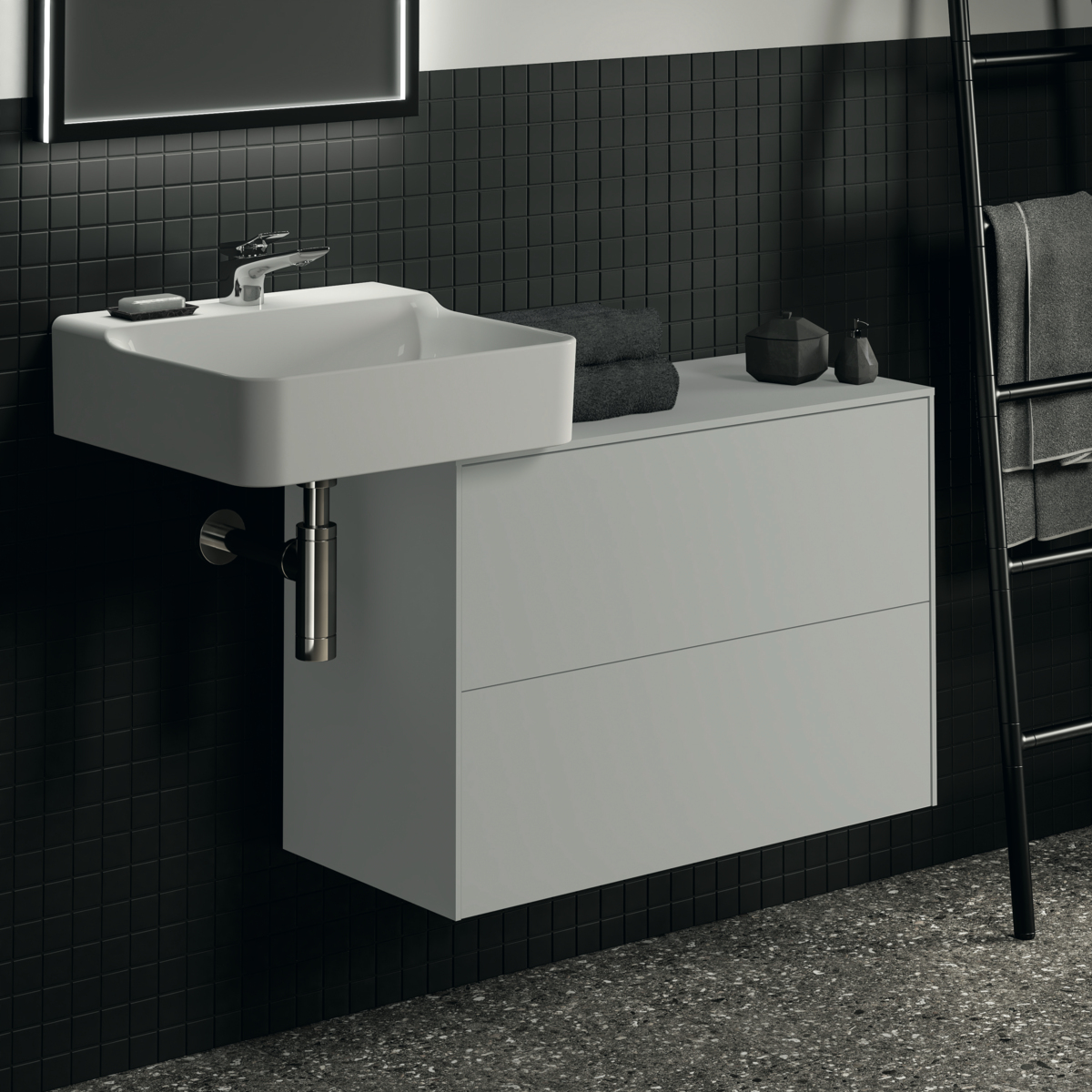 CONCA Тумба 80 см для раковины, узкая проекция 37 см, без выреза в столешнице. Комбинированная система для удобного использования (открытие "Push to open" + закрытие "Soft close"). Внутренняя отделка ящиков цвета антрацит. 2 внешних ящика. Внутренняя отделка ящиков цвета антрацит. 2 внешних ящика. Для монтажа с раковинами Conca 40/50/60 см (с шлифованной нижней поверхностью) или Conca vessel 45/60 см или Extra 45/50/60/70 см (с шлифованной нижней поверхностью) или Extra vessel 50/60 см или Ipalyss vessel 40/55/60/65/80 см или Linda-X 50/60/75 см (с шлифованной нижней поверхностью) или Linda-X vessel 45/55 см
