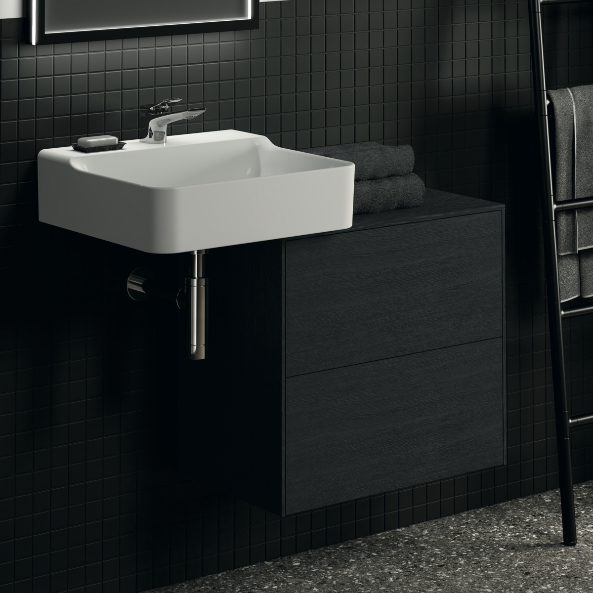 CONCA Тумба 60 см для раковины, узкая проекция 37 см, без выреза в столешнице. Комбинированная система для удобного использования (открытие "Push to open" + закрытие "Soft close"). Внутренняя отделка ящиков цвета антрацит. 2 внешних ящика. Для монтажа с раковинами Conca 40/50 см (с шлифованной нижней поверхностью) или Conca vessel 45 см или Extra 45/50 см (с шлифованной нижней поверхностью) или Extra vessel 50 см или Ipalyss vessel 40/55/60 см или Linda-X 50/60 см (с шлифованной нижней поверхностью) или Linda-X vessel 45/55 см