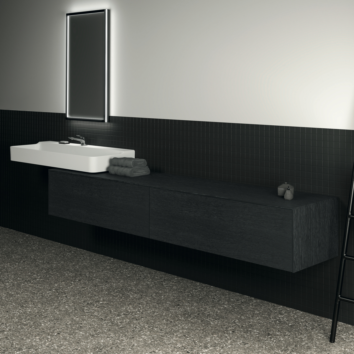 CONCA Тумба 240 см для раковины, без выреза в столешнице. Комбинированная система для удобного использования (открытие "Push to open" + закрытие "Soft close"). Внутренняя отделка ящиков цвета антрацит. 2 ящика. Для монтажа с раковинами Conca 40/50/60/80/100/120 см (с шлифованной нижней поверхностью) или Conca vessel 45/60 см или Extra 45/50/60/70/80/100 см (с шлифованной нижней поверхностью) или Extra vessel 50/60 см или Ipalyss vessel 40/55/60/65/80 см или Linda-X 50/60/75 см (с шлифованной нижней поверхностью) или Linda-X vessel 45/55 см