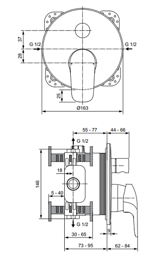 Картридж 47 мм с функцией HWTC (ограничение максимальной температуры горячей воды), с функцией CLICK (ограничение потока воды)