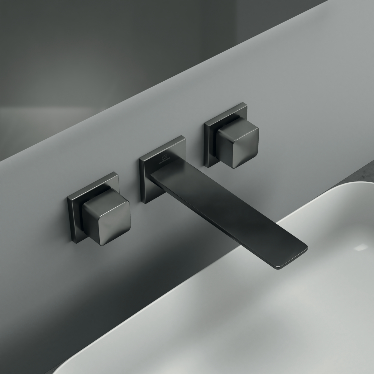 CONCA Встраиваемый смеситель для раковины, полный комплект (внешняя + встраиваемая части), керамические вентили G1/2’’, литой излив 180 мм, металлические накладки с логотипом Ideal Standard, аэратор Coin slot M24x1 с ограничением потока 5 л/мин