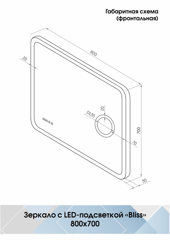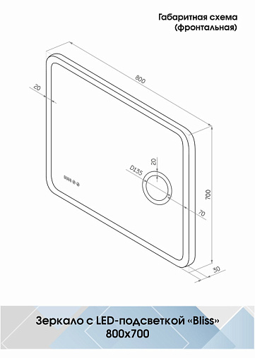 Зеркало с подсветкой "Bliss Led" 800х700 с увеличительным зеркалом, часами - это настенное зеркало нового поколения, изготовленное из полотна толщиной 4 мм от ведущего европейского производителя AGC. При изготовлении используется светодиодная лента с плотностью диодов 120 шт/м и мощностью 9,6 Вт/м, обеспечивающая яркое и равномерное свечение. "Bliss Led" 800х700 с увеличительным зеркалом, часами - это прямоугольное зеркало для ванной шириной 80 см, высотой 70 см. Вес зеркала с упаковкой - 8,7 кг. Для управления подсветкой используется cенсор. Температура внутренней подсветки холодная - 6000К, потребляемая мощность 32 Вт. Основа для изделия - корпус из ударопрочного пластика белого цвета. В зеркале установлены часы с индикацией температуры. Увеличительная линза, вмонтированная в зеркальное полотно сделает косметические процедуры удобнее.Срок гарантии - 2 года.