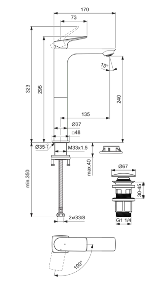 Высокий смеситель на столешницу CeraLife C 29,5 см, матовый, высота до излива 24 см, неповоротный излив, чёрный цвет, с донным клапаном, холодный старт, Ideal Standard
