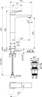 CeraLife C 29,5см, высокий смеситель на столешницу, неповоротный излив, с донным клапаном, холодный старт, высота до излива 24 см, арт. BE051AA, Ideal