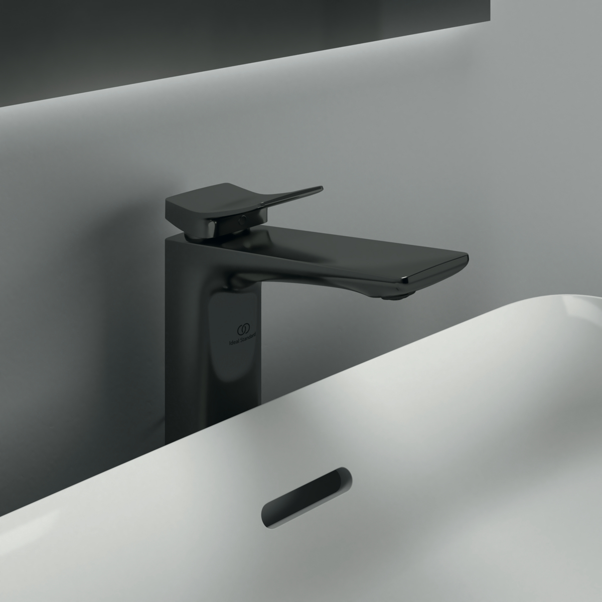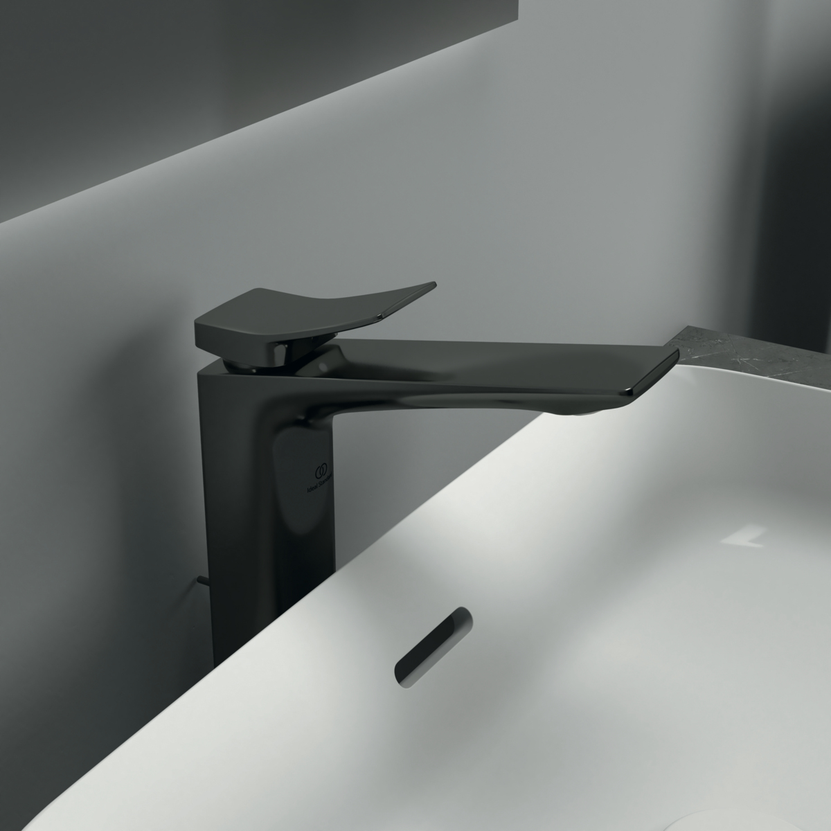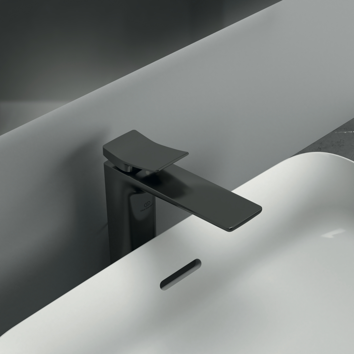 CONCA Однорукоятковый смеситель для раковины Vessel с донным клапаном, керамический картридж 28 мм, с функцией HWTC (ограничение максимальной температуры горячей воды), без функции CLICK, логотип Ideal Standard на корпусе, металлическая рукоятка без индикаторов горячей/холодной воды, аэратор Coin slot M24x1 с ограничением потока 5 л/мин., система монтажа EASY-FIX (облегченный монтаж), гибкая подводка G3/8" PEX, металлический донный клапан. Цветное покрытие - технология PVD