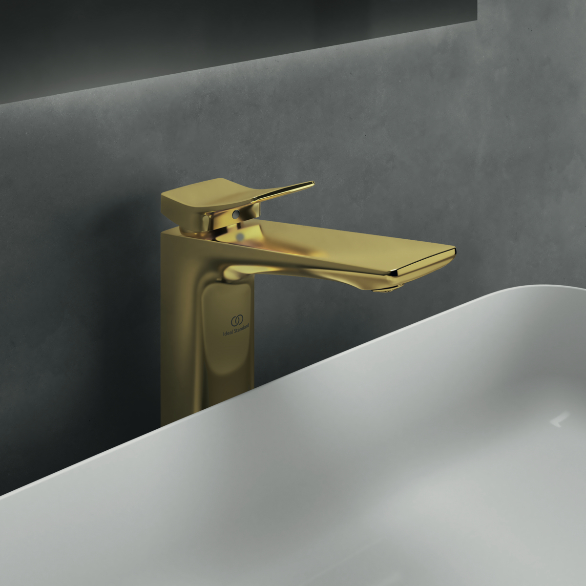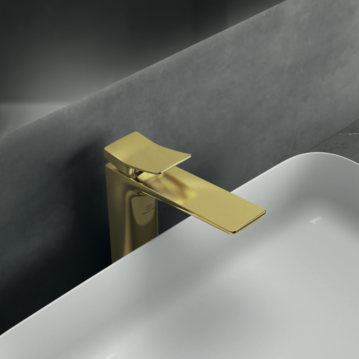 CONCA Однорукоятковый смеситель для раковины Vessel, керамический картридж 28 мм, с функцией HWTC (ограничение максимальной температуры горячей воды), без функции CLICK, логотип Ideal Standard на корпусе, металлическая рукоятка без индикаторов горячей/холодной воды, аэратор Coin slot M24x1 с ограничением потока 5 л/мин., система монтажа EASY-FIX (облегченный монтаж), гибкая подводка G3/8" PEX. Цветное покрытие - технология PVD