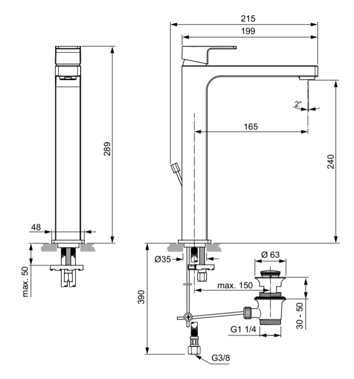 Edge 24см, высокий смеситель на столешницу, неповоротный излив, с донным клапаном, аэратор perlator, картридж 25мм, арт. A7112AA, Ideal Standard