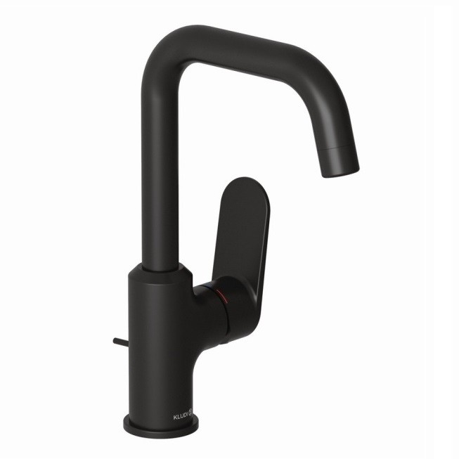 Высокий смеситель на столешницу X1 20,5 см, матовый, управление сбоку, поворотный излив, чёрный цвет, с донным клапаном, Kludi