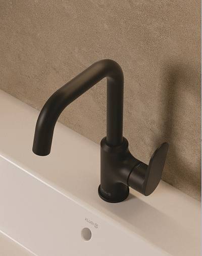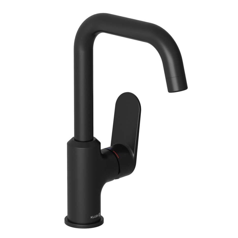 Высокий смеситель на столешницу X1 20,5 см, матовый, управление сбоку, поворотный излив, чёрный цвет, без донного клапана, Kludi