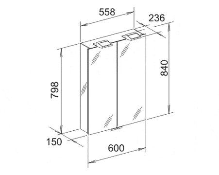 Внутреннее оснащение: - 1 выключатель, - 2 розетки, - 3 регулируемые по высоте стеклянные полки, - 1 универсальная полочка, - 1 стакан, - 2 контейнера для мелочей. Внешний размер: 600 x 840 x 150 мм.
